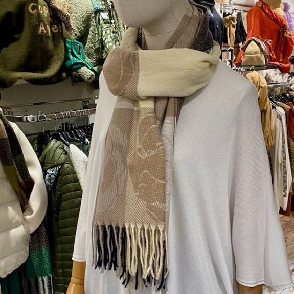 Élégante et facile à porter, cette écharpe à franges se distingue par son motif de grosses roses très discret, travaillé tout en douceur.