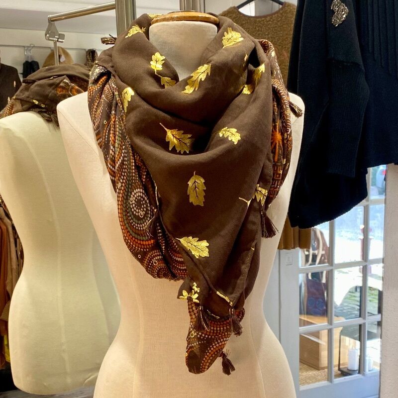 Le moif, inspiré de la nature, se compose de feuilles délicatement rehaussées de dorure, offrant un éclat subtil et raffiné. L'écharpe est divisée en quatre carrés, chacun présentant un motif différent pour un rendu unique, riche et original.