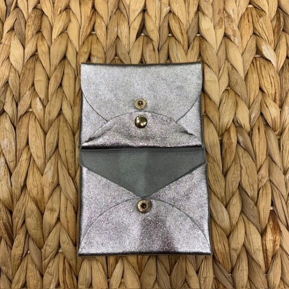 Ce porte-monnaie pliant entièrement en cuir séduit par son coloris gris argenté brillant, à la fois moderne et raffiné.Son format compact, qui se plie en deux, en fait un accessoire pratique et facile à glisser dans tous les sacs.