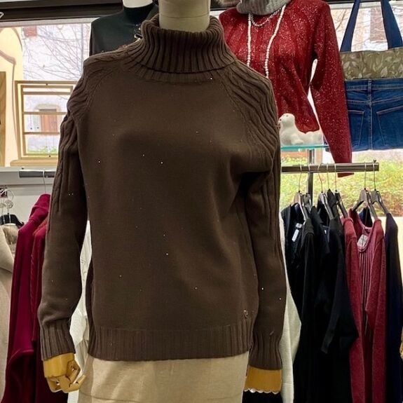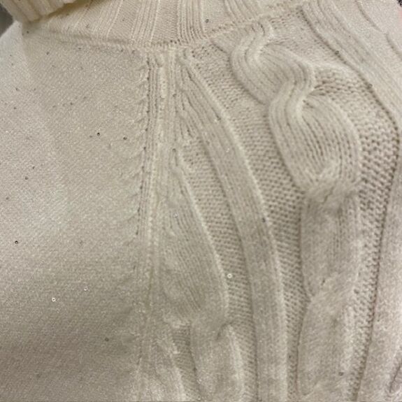 Le col roulé bien structuré enveloppe le cou avec élégance, tandis que de subtils sequins brillants viennent illuminer la maille sans en faire trop.
