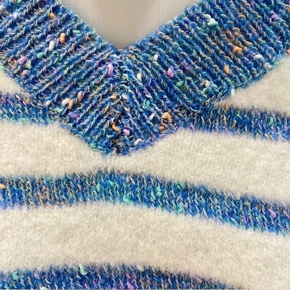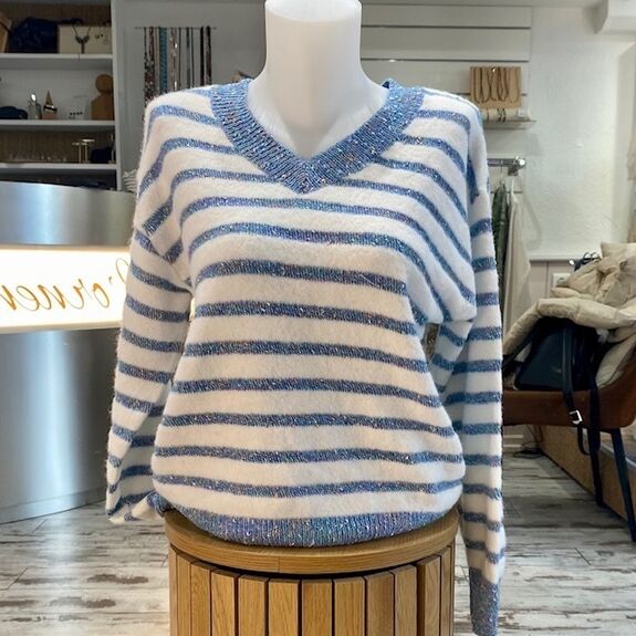 Ce pull court à rayures pour femme séduit par sa maille douce légèrement brillante et son style moderne. Son col V féminin met le décolleté en valeur, tandis que sa coupe courte s’associe idéalement à un jean taille haute, un pantalon fluide ou une jupe.