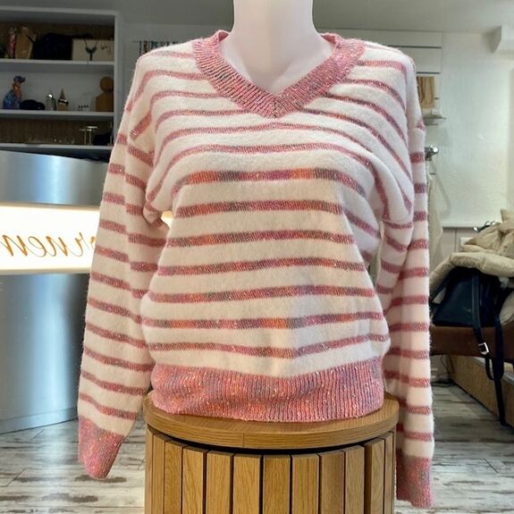 Disponible en bleu ciel ou en rose, ce pull rayé femme apporte une touche lumineuse et tendance à toutes vos tenues. Confortable et extensible, il convient du 36 au 42.